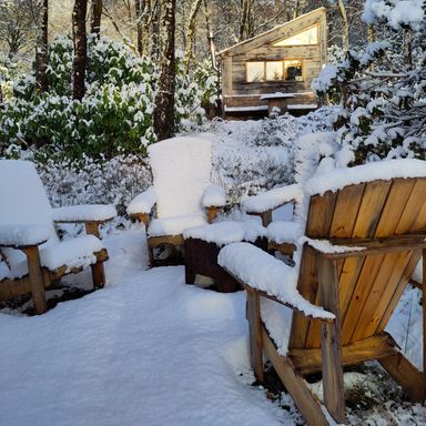 Comfy handmade wooden chairs outside by firepit - great for sitting out in the evening. The outside was bath was lovely and relaxing. Loved it, and will definitely be back to stay again