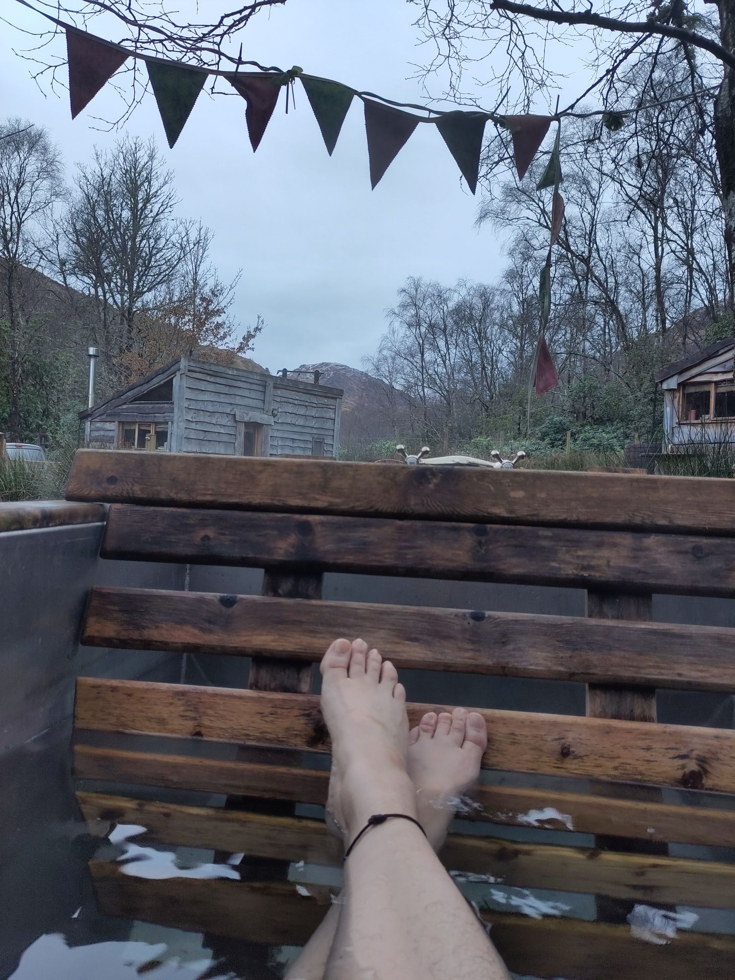 We love hot tubs, but not the vast amounts of water and chemicals that go along with them. So instead we have a Swedish-style outdoor bath which we have converted to run on our renewable electricity. It takes around 1 hour 10 mins to fill with hot water. There's no 'tap end', so it's big enough for two to relax and gaze up at the trees and stars.